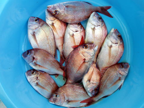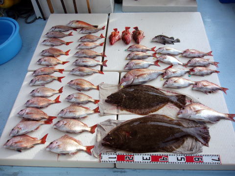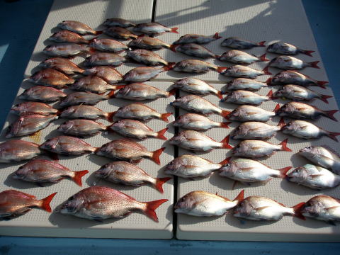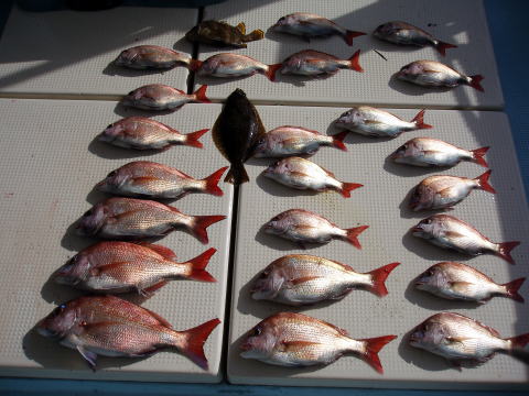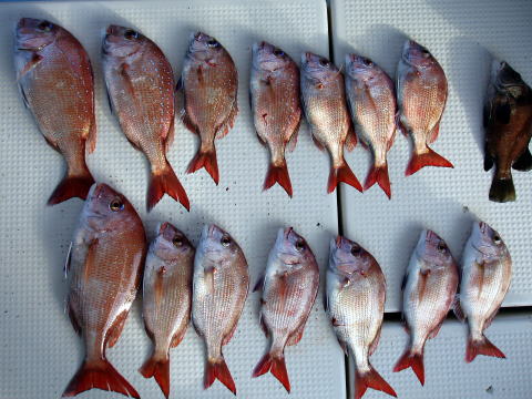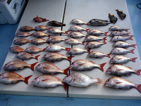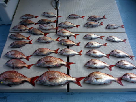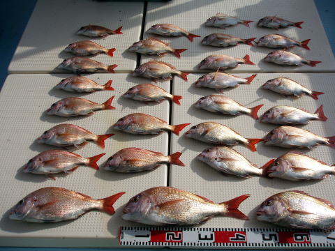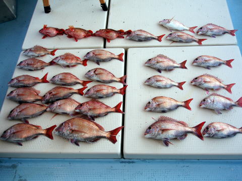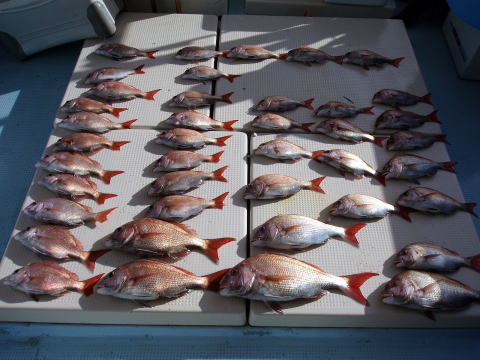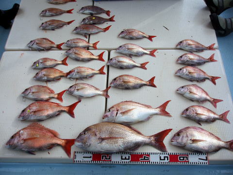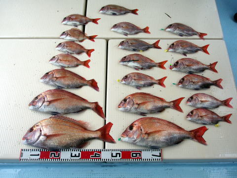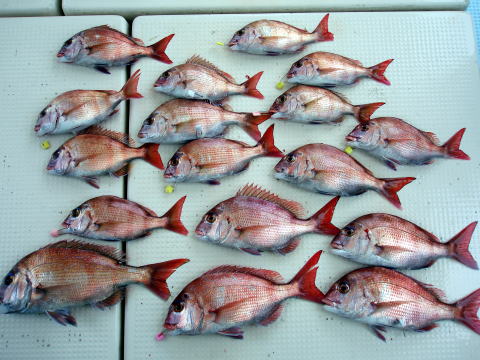 今日も朝からベタ凪! 今回も格安真鯛で出船 しました。 皆さん竿テンヤは初挑戦との事で、恒例 のミニ講習から^^ しかし、いざ釣ってみると皆さん 上手に釣られます。 サイズは大型こそ釣れません でしたが、食べごろサイズの1,9kg頭の真鯛〜 今日は皆さん楽しめたご様子で良かったです^^ 土曜、日曜キャンセル出ました・・・ 船長ちと寂しいです・・・ 初心者の方でも、これだけ釣れてます。 今日もボウズなしです! 皆さん挑戦しに来て下さい。 お待ちしております。 真鯛・・・1,9kg頭に33匹。 ミニ真鯛はすべてリリース済み |