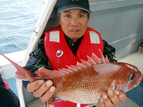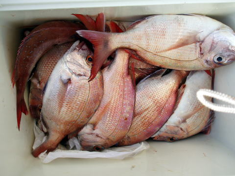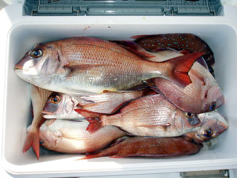 今日はご予約がなかったので休船の予定だったので すが前日に松田様とお連れの林様の二名様のご予約 があり急遽活きエビ探し・・・ 苦労しました・・・ 朝からも知り合いの船長にエビを分けてもらって何とか エサ確保。 苦労した甲斐あって今日は大鯛あがりまし た^^ 一投目から松田様に5,3kgの大鯛! 続いて林様も良型真鯛GET!今日は小潮の2日目 なので瀬際をピンポイントで狙いました。 数はあがりませんでしたが大鯛釣られて良かったです^^ 自己新記録だそうで大変喜んでおられました。 今日の竿は凄く食い込み良さそうでバッチリでしたね〜 今度は大潮まわりで挑戦してみたいとの事でした。 13日の金曜以降は潮がおきますのでお勧めです! 今日はお疲れ様でした。 初乗船ありがとうございました。 PS:活きエビの準備がありますので、せめて2日〜3日前までにご予約お願い 致します。 ご予約のない前日は活きエサの準備が出来ません。 ご了承下さい。 13日{中潮}から23日までお勧め潮です。 大鯛狙って下さい。 平日は2名で格安真鯛出船します。 今年の大鯛、釣られた皆さん自己新記録だそうです。 挑戦お待ちしております。 真鯛・・・5,3kg頭に18匹。 {5,3kgの真鯛は即シメの為クーラーの中} その他・・・アラカブ、シログチ、キングチ、コウイカ、フグ} |