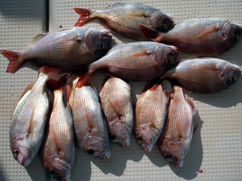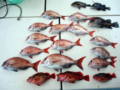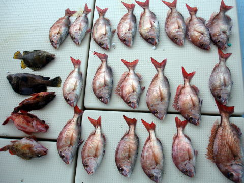 今日も格安真鯛で出船しました。大潮の2日目! 今日は半数の方がテンヤ釣り初挑戦との事で いつもの様にミニ講習〜 ポイント着の波状況も 凪で良かったです。 今日はアタリが出る方と出 ない方の差があったみたいです。 潮的には 今回は期待してたんですが、思うような釣果が 出ませんでした。 昨日の半分しか釣れません・・・ 自然相手は難しいですね・・・ 初乗船の黒木様、元松様もテンヤ釣り挑戦されまし たが今回は残念ながら御二人で9匹でした。 せっかく来てくださったのに気のどっかです・・・ 又のリベンジお待ちしております。 今日乗船の皆さんありがとうございました。 そして、お疲れ様でした。 真鯛・・・1,8kg頭に20匹。 ミニ真鯛はすべてリリースしてもらいました。 ご協力ありがとうございました。 その他・・・アラカブ、、シログチ{各自クーラーの中} |