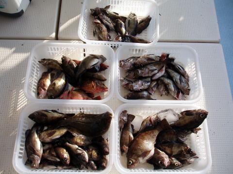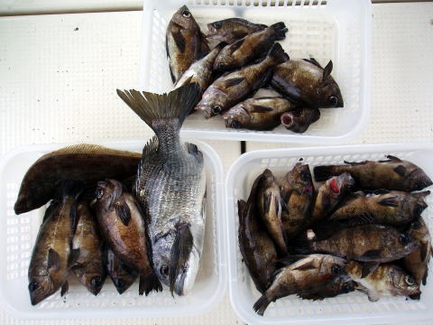 今日は朝から凄い霧でした。 10mより先がまったく見えません・・・ 安全の為に出船時間をずらしての出船でした。 2時間以上出るのが遅かったので時合を逃して しまいました。 よって今日は残業しました。 人によって釣果に差が出てしまいましたが常連の 佐藤様は二桁いかれたようでした^^ 良型のアラカブもGETです! 今一つ納得がいかない一日となってしまいました。 皆さんすいませんでした。 今日乗船の皆さんお疲れ様でした。 真鯛・・・27匹。 アラカブ・・・メタボ3匹。 その他・・・マダコ、キス、グチ、セトダイ、フグなど。 {各自クーラーの中} |