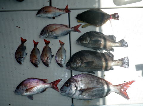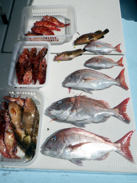 悪天候続きで久々の出船です。 近場の真鯛{テンヤ、タイラバ}で出船しました。 真鯛、初挑戦の方に仕掛けの作り方などミニ講習 して出発〜 朝は少し風がありましたが風向きなど 考慮して予報ものちに良くなるとの事で予定通りに ポイントまで走りました。 まずはこの時期の1級ポイントにて流しましたが 真鯛の反応が今ひとつ・・・ 今日は 天気ヨシ! 潮ヨシ! 濁りなし! ベイトもヨシ! 流れもヨシ! すべて良く、この条件で何故かアタリ少ない・・・ 一体どうしたんだ・・・??? 自然はわからんもんです・・・ 下の写真以外の真鯛、アラカブ、キス、その他は 各自クーラーの中で写真は撮ってません。 残念ながら今日は真鯛の釣果が伸びませんでした。 外道ばかりです。 皆さん今日はありがとうございました。 |