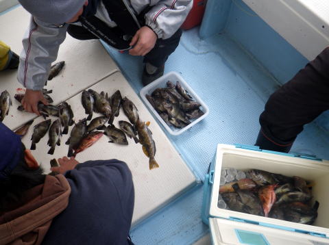 数日前の予報が悪く日曜ですが少なめの人数で 出船しました。 しかし予報は雪予報から 晴れになり良かったです。 朝の一流しから良型連発で一気に盛り上がりました。 ダブル、トリプルで上がってきます! しかし・・・ 長続きせず潮どまり・・・ しばらく沈黙・・・ 今日は大潮!下げ潮早いです。 下げ潮が流れ出してポツポツ食いだしましたが なかなか爆釣なく結局単発状態・・・ あちこちまわってメバルの大きな群れ見っけ^^ そのポイントで釣れ続きました。 皆さん一気に数が増えました! 蓋を開けてみればかなり釣れた感じです。 大爆釣まではいかないが中爆釣?です^^ 通常は数が多い方、少ない方と釣果に バラツキがあるのですが 今日は数が少ない方いません。 皆さん納得の釣果で良かったです。 良く質問されるのですが、潮はどんな潮が良いの? と、よく聞かれます。 大潮が好きな方、小潮が好きな方と と色々です。 まあ〜好みでしょう。 今日は大潮ですが・・・ どんな小さな事でも良いので分らない事がありましたら 遠慮せずに何でも船長に質問して下さい。 今日乗船のお客様ありがとうございました。 引き続きご予約も又もらいました。ありがとうございます。 お疲れ様でした。 30日、31日と船長お勧めです。下りの中潮です。 天気も良く穏やかになりそうです。 お1人でも大歓迎です。 遊びに来ませんか^^ |
