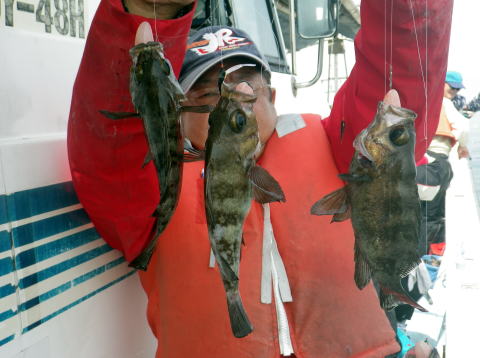 今日も天気良く、平日出船です。 お客様は高力様、末松様、、ミスターM様{顔NG}・・・ 型狙いなのでポイント限定・・・ しかし今回は中型メバルが多くて困りました・・・ 深さも40mラインのポイント〜 反応があれば3連、3連!と連ちゃんで上がって きます。 竿頭で35匹でした。 尺はいませんが良型サイズ沢山います^^ 今日はカブラが良かったです。 皆さん今日はお疲れ様でした。 明日も頑張ります! |