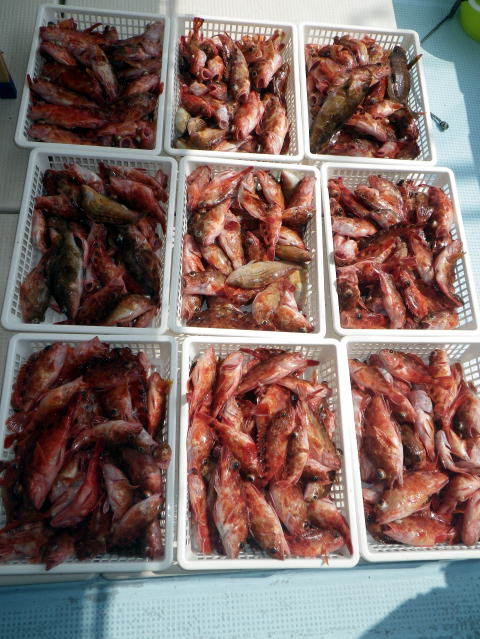 昨日に引き続き季節限定遠征アラカブです。 今日も天気も良く絶好の釣り日和です。 昨日と同様に訳わからん位釣れ続きました・・・ かなりの量です。 釣りと言うか作業でした。 今日も皆さん休憩なしに黙々と釣ってます。 400〜500匹位釣れてるのかな?? とにかく大漁です! 全員大漁です! お疲れ様でした。 |
