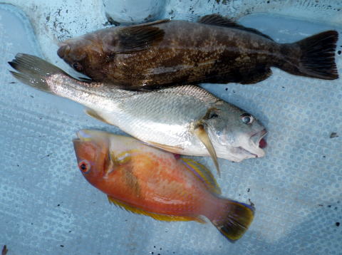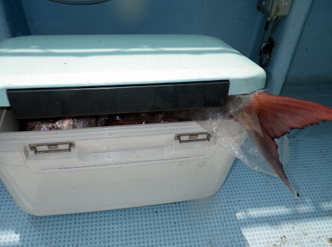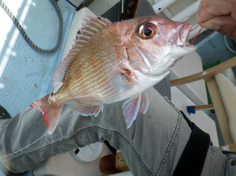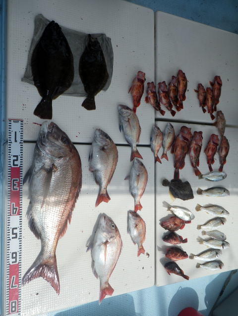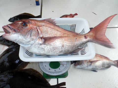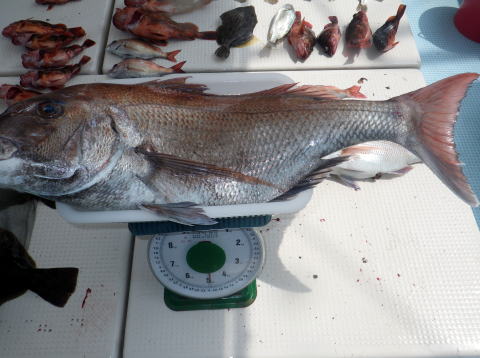三日前の初日は最高でした! でも今日は何故か・・・??? 潮は言うことなしですが・・・ 天気良し!潮良し!風無し! 何で大鯛釣れない?? 釣れた真鯛は小型・・・塩焼きサイズ 一応、五目以上は釣れたのですが・・・ お客様のクーラーはその他にアラカブ、キスなど 外道ばかりでした。 本命少なく今日は寂しい釣果です。 お疲れ様でした。 |