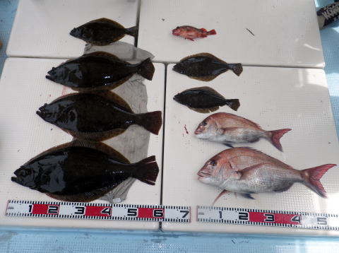 今日は今年初の近場真鯛五目です。 今日乗船のお客様は田上様と今村様です。 近場真鯛五目釣りは25日から出船予定でしたが ちょっと早めに行きたいとの事で急遽今日出船 しました。 朝から天気も良く釣り日和です。 ポイント着後、一流し目から活性良く真鯛GET! 二流し目も真鯛GET! 今日は船長大好きな下げ潮がたっぷりあります^^ 釣り方はテンヤ釣りと鯛ラバです。 名前の通り、真鯛五目で今日釣れたのは 真鯛、ヒラメ、アラカブ、カワハギ、グチ・・・ 色んな魚種が釣れるのでお客様大喜びでした^^ 初日から活性良く、お客様楽しめたご様子です。 近場真鯛五目は2名で出船しますのでお待ちしております。 又、泳がせヒラメもぼちぼち開始しますので ご希望の方はお問い合わせ下さい。 田上様、今村様 今日はお疲れ様でした。 ご予約はお客様をお迎えする準備がありますので 早めのご予約お待ちしております。 釣り道具は竿、リール、ハリスだけ持ってきて 下さい。 テンヤオモリ、テンヤ用針、エビなどは無料にて こちらで準備致します。 尚人丸ではテンヤオモリ、テンヤ用針は 使い放題です。 珍しくヨカ天気が続きますね・・・ 日曜までは天気良さそうです。 |