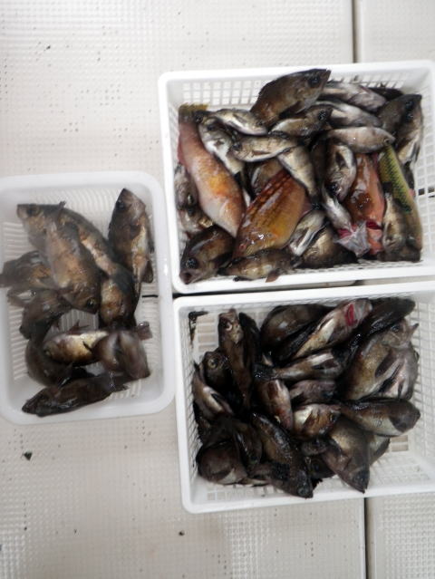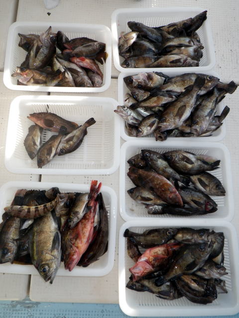 今期メバル二日目です。 お客様は古賀様ご一行です。 前半戦は魚探の反応高活性でした。 2連、3連は当たり前で、最大でメバルが6連! かなりメバル浮いてましたね。 しかし食いが長続きせずに苦労しました。 こうなれば数をこなすしかないですね・・・ あちこちまわって反応の良い所だけを 攻めていきました。 前半は天気も良かったのですが後半は 早めに雨が降ってきましたね〜 予報では昼過ぎに雨の予報でしたが・・・ でも雨も風も大した事なかったので 皆さんには頑張ってもらいました。 帰りは雨も土砂降りでした。 皆さん今日はありがとうございました。 港に帰ってからは雨も強くなったので 全体写真は撮れずじまいで 代表で古賀様とI様の二人分だけ写真を 撮らせて頂きました。 二人合わせて80匹オーバーです。 明日は時化予報で出船中止です。 明後日まで時化みたいです。 |
