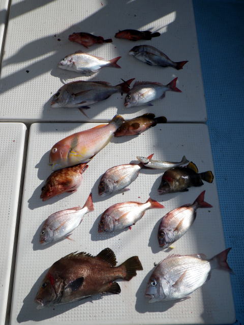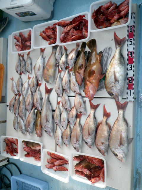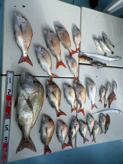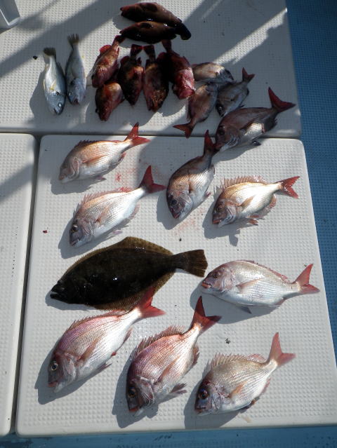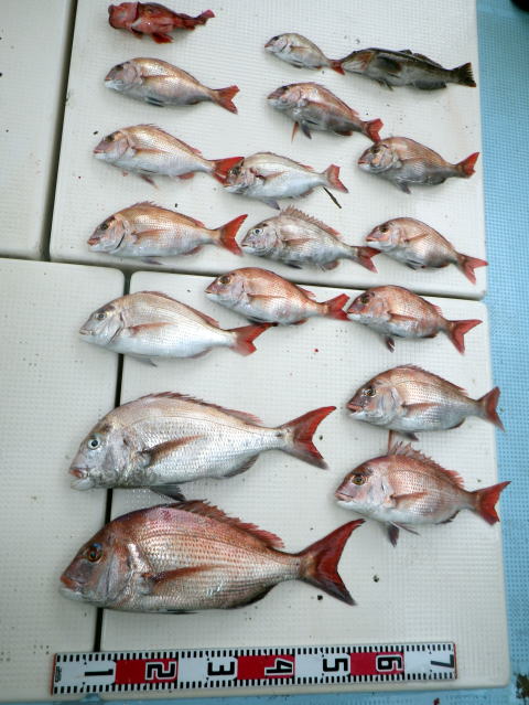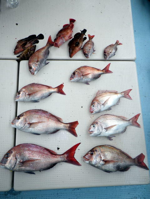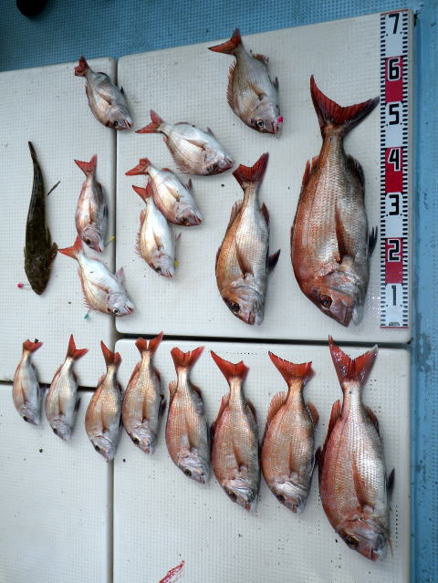 今日は真鯛で久々出船です。 今回も鯛ラバとテンヤで挑戦です。 鯛ラバ専門が今日は渋いです・・・ 写真の釣果はほとんどエビ使用・・・ 釣果にも差が出てしまいました。 せめてこの二倍は欲しかったですね・・・ ボチボチ大型真鯛みたいですね〜 次回に期待です。 今日乗船のお客様、ありがとうございました。 明日も頑張ります! |