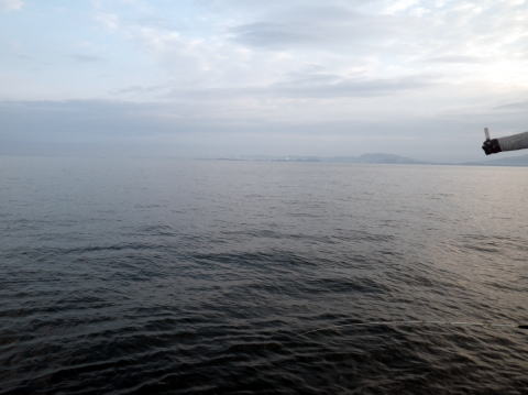 | ポイント到着〜 正面に見えるのは三池港・・・ 煙突の煙がまっすぐ・・・ベタ凪です ![]() 2015年 1月4日 |