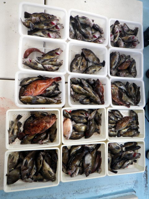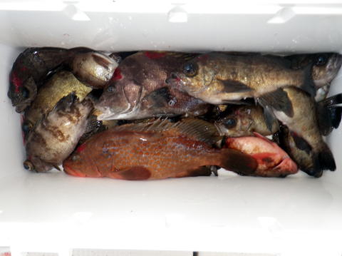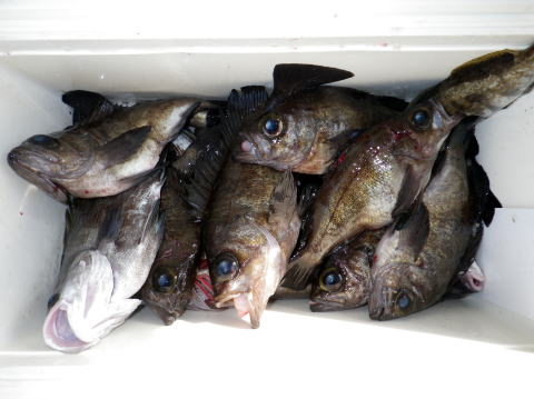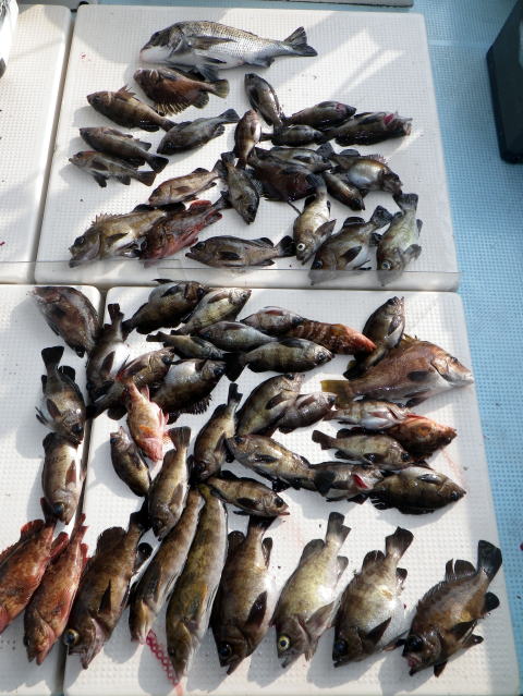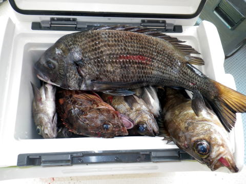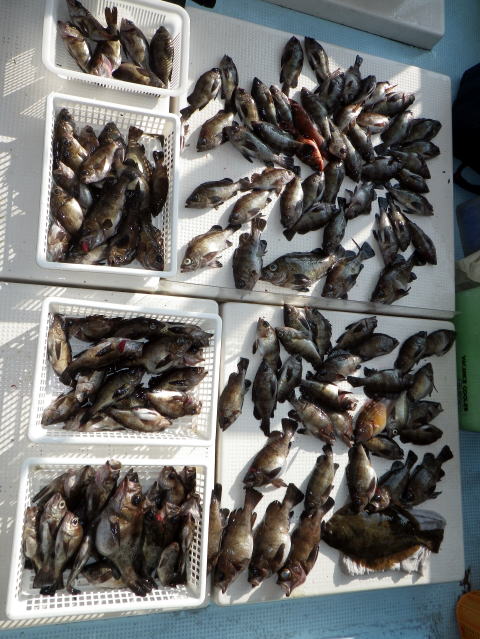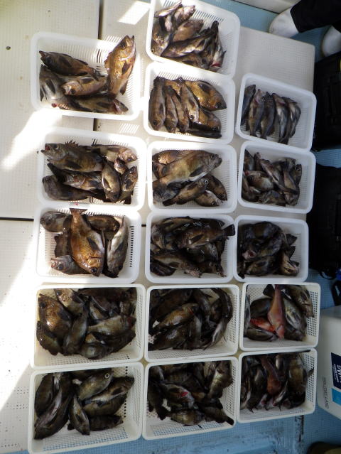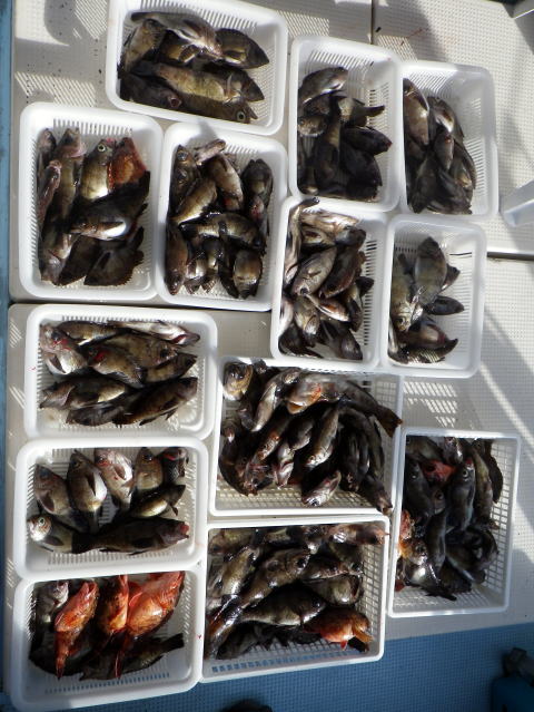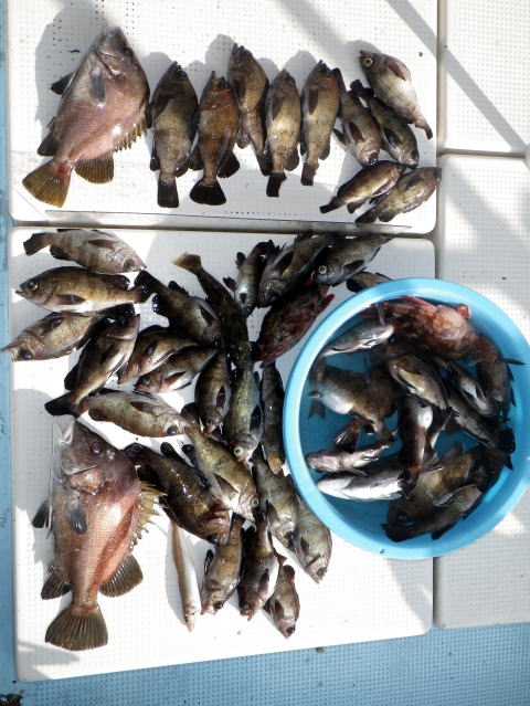 今日も数はいらないからサイズ狙いの要望です。 朝から北よりの風が強くて揺れながらの釣りです。 皆さんアタリが取り難く苦労されてました・・・ 釣ったメバルも船べりでポトポト落ちます・・・ シケで食いが浅い感じですね〜 今日は尺メバルはいませんが尺近くはいます^^ 今回はクーラー直入れのお客様方が多かったので イケスのみの数人の方の写真を代表で 撮らせていただきました。 大タライは内田様の生かして持ち帰り分です。 昨日の様にガツガツ食ってくる感じと違い モソモソと食ってくる感じでした・・・ 皆さん今日はご乗船ありがとうございました。 次回は明後日{14日,小潮}に人数が揃えば出船です。 現在1名お待ちです。 穏やかな海況になりそうですね。 |