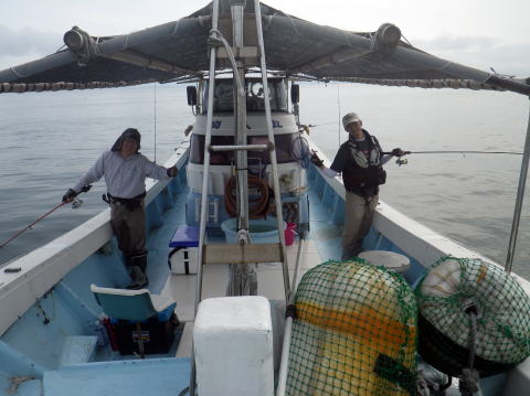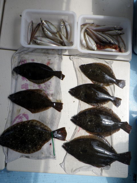 今日は少人数で泳がせヒラメ出船です。 風もやみ朝からベタ凪です! いつもの様に潮が流れてる時にヒラメ。 潮どまりにキス釣りです。 今日の良型サイズは草野様が釣られた ヒラメ2kg弱2匹です。 お一人で計3匹釣られました^^ いつも安定した釣果ですね〜 後半は思うように潮が流れず食い込み渋くて 針掛かりせず、あげてみると歯形ばかりでした・・・ 人によって釣果に差が出てしまいましたね。 お疲れ様でした。 明日も少人数で出船予定してます。 頑張ります! 明後日月曜まではお天気よさそうですね^^ 明日も明後日もガラ空きです・・・ |