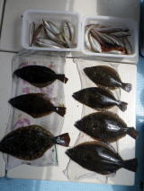 泳がせヒラメとジャンボキスのリレーです。 今日も朝から潮どまり・・・ 流れないとヒラメのアタリ出ないので今回も キス釣りで皆さんに楽しんでもらいました^^ キスは良型揃いと言うかジャンボサイズです。 ヒラメは昨日みたいな超〜特大級はいませんが 60cmと59cmの良型です。 皆さん今日はありがとうございました。 今週平日12日までゆったり流れの潮周り。 入門用に最適かと思います。 お時間ある方お待ちしております。 キス釣り、又はヒラメとキスのリレーなど。 今年はヒラメの大型が例年になく釣れるので 真鯛釣りは来月に延ばします。 今の内に皆さん大ヒラメ釣って下さい。 |