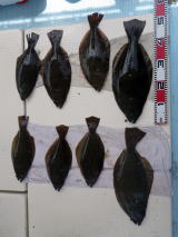 いつもお世話になっております。 常連の猿渡様です。 前回は竿頭でヒラメ9匹。 そして今日も竿頭です。{今回は控えめ・・・4匹} おまけに、良型賞{2kg弱}も独り占めです^^ |