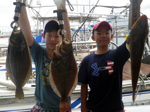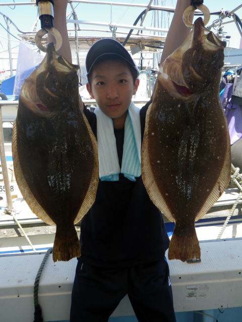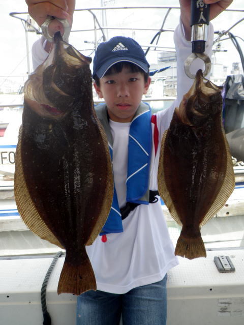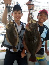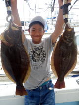 | 尚人丸初乗船及びヒラメ初挑戦の龍輝君 見事ヒラメ2匹GET! ![]() 2015年 8月1日 |