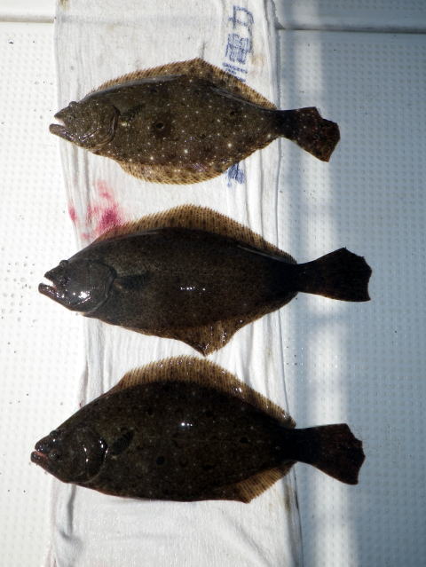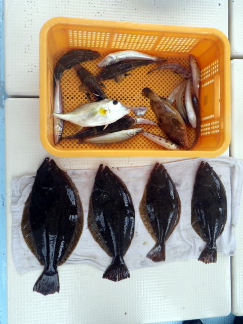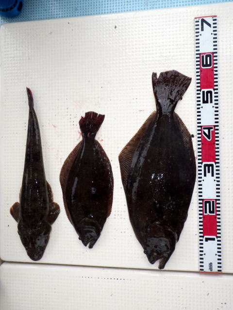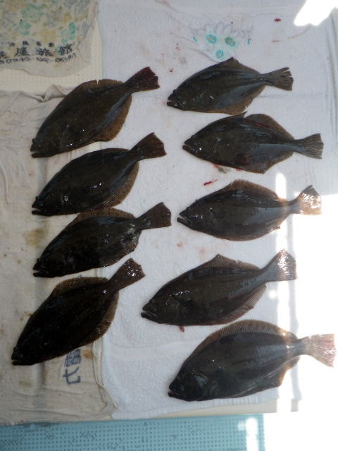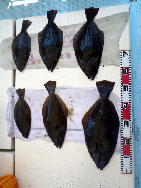めったにない事ですが、朝から生きエサが 釣れません・・・スナメリでもいるのか?? 数日前は20~30分で300弱釣れたのですが・・・ おかげで朝の時合いを逃してしまいました・・・ 時間延長して後半の下げ潮で頑張ってもらうしか ないな~^^ しかし・・・ 今日はヒラメにはヨカ潮なんですが食いが渋いです。 前回ヒラメ1匹だけしか見れなかったリベンジの 辻様は一人でヒラメ3匹GETです! リベンジ成功でした^^おめでとうございます。 今日は釣果に差が出た一日でした。 最近少しムラが出てる感じですね~ 食い込ませるタイミングで差が出てる感じです。 合わせるタイミング、早すぎてもダメだし、 遅すぎてもダメだし・・・ 難しいです・・・ ヒラメ釣れなかったお客様、今日はごめんなさい。 また遊びに来て下さいね。 お疲れ様でした。 明日も頑張ります! 左のヒラメは辻様一人分です。 |