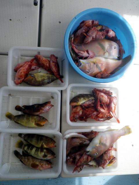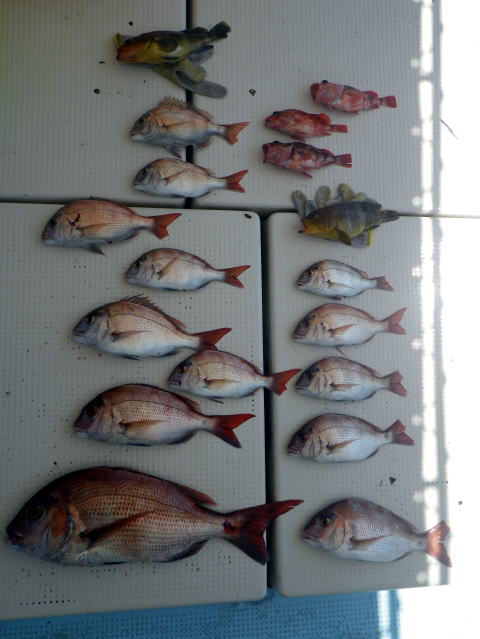 今日は予報悪く出船人数に達しないと思って ましたが、常連様方から雨予報でもご予約 いただきました。 ありがとうございます。 しかし、当日は雨なんか一滴も降らずに青空も 途中で見えてきて穏やかな海況です。 皆様の気持ちが通じたのかも^^ さて今日は遅れていた近場の真鯛出船です! テンヤの方1名とその他の方は鯛ラバで挑戦です。 挑戦前に情報が入り前日は真鯛の活性が 良かったと聞き、テンションアップです^^ しかし話とは裏腹に大型真鯛はヒットせず・・・ 食べ頃サイズの真鯛ばかりでした・・・ でも嬉しい外道のアコウ、アラカブ、コショウ鯛 など色々釣れました。 今年の近場ポイントはアコウがよくヒットします。 例年にはない状況です。 通常は外道でシログチばかりくるのですが・・・ アコウなら大歓迎です^^ 鯛より美味いし~ 来月からはいよいよ真鯛釣り楽しめる時期です。 泳がせヒラメも混ぜながら予定してますので 乞うご期待です。 今日乗船の皆さんありがとうございました。 来月からも船長頑張ります! |